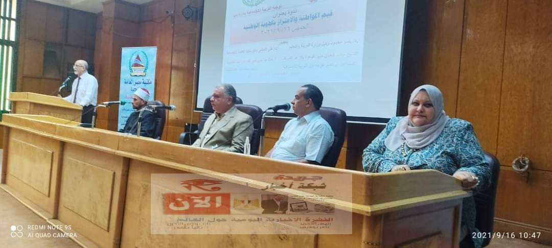 قامت فى يوم الخميس الموافق16/9/2021 فى تمام تشرفت مكتبه مصر العامه ببنها بالتعاون مع توجيه التربيه الاجتماعيه باداره بنها ، حيث قامت بالقاء ندوه بعنوان: قيم المواطنه والاعتزاز بالهوية الوطنيه ، وذلك فى إطار الاهتمام بتنميه الوعى بقيم الانتماء والمواطنه كأحد أساليب المحافظه على الوطن و مكتسباته.