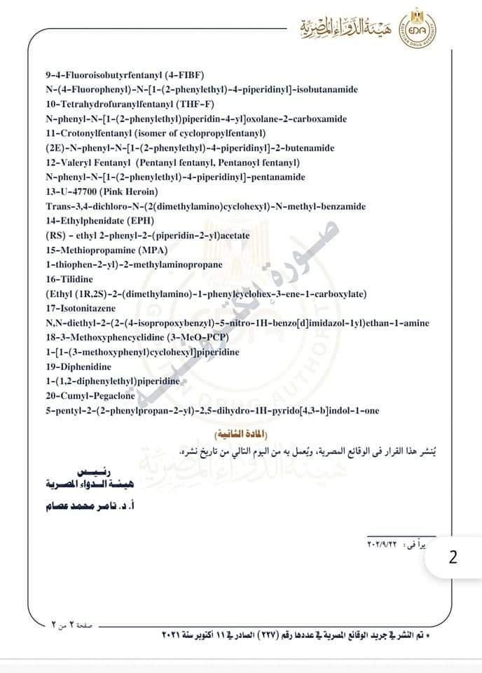 أعلنت هيئة الدواء المصرية إضافة ٢٠ مادة جديدة إلى القسم الثاني من الجدول رقم (۱) الملحق بقانون المخدرات رقم (١٨٢) لسنة ١٩٦٠ الخاص بمكافحة المخدرات وتنظيم استعمالها.