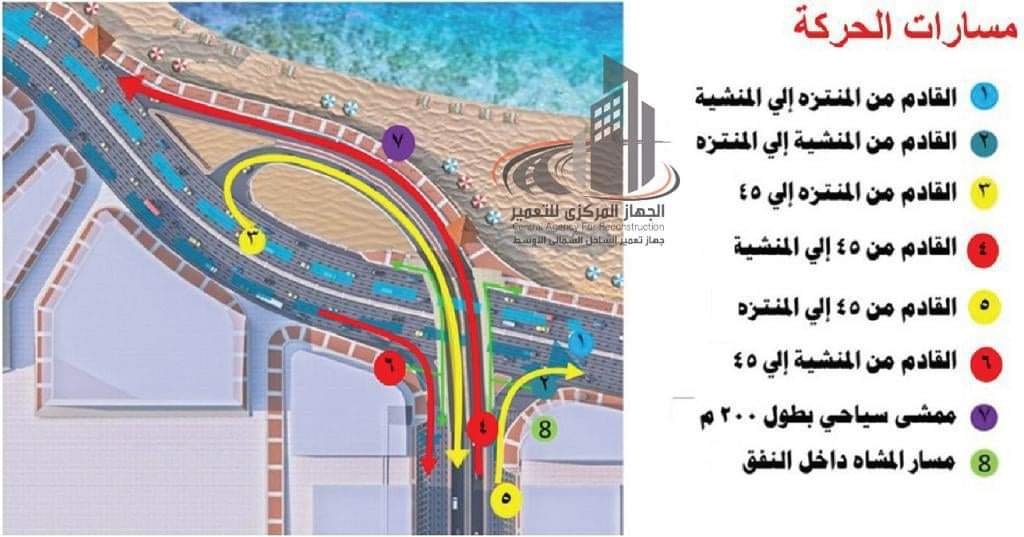 وأشار رئيس الجهاز المركزي للتعمير، إلى أنه يوجد مدخلين لنفق المشاة الواحد، مدخل قبلى على رصيف العمارات، ومدخل من أعلى النفق مباشرة على شارع السادات للوصول بهما إلى الجهة المقابلة من البحر، أما الصعود للمشى على رصيف الكورنيش البحرى أو النزول إلى الشاطئ بأطوال 140 م تقريبا لأنفاق المشاة بجميع الاتجاهات، بجانب توسعة الطريق من 6 : 10 حارات بعرض 35 م تقريبا، شاملة الجزيرة الوسطى بعرض 2 م، و2 رصيف مشاة على الجانبين بطول 600 م تقريبا.