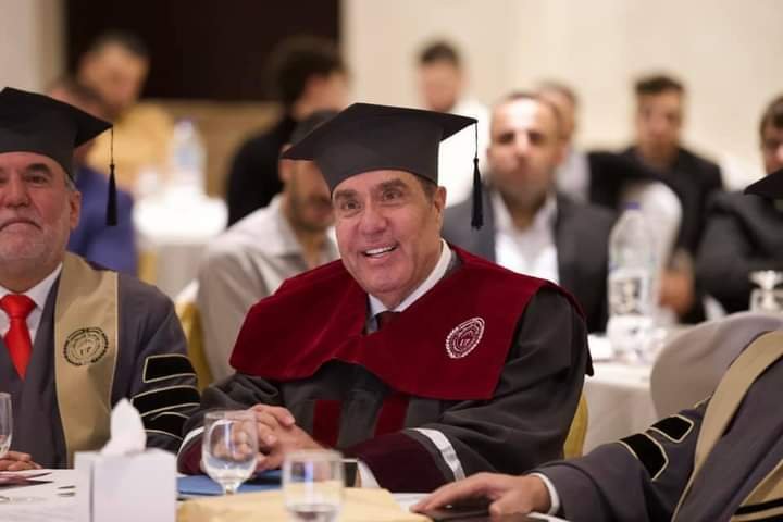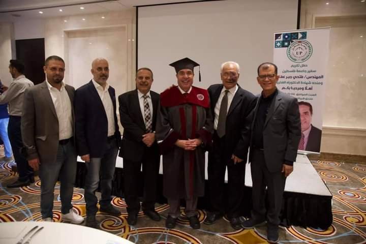 وأضاف: يشرفني بالأصالة عن نفسي والنيابة عن زملائي في مجلس إدارة جامعة فلسطين ومجلس الجامعة بهيئتيه الأكاديمية والإدارية أن نقدم شهادة الدكتوراه الفخرية إلى المهندس فتحي جبر عفانة «سفير جامعة فلسطين» لجهوده الكبيرة في خدمة الجامعة والمجتمع الفلسطيني والعربي، وحق لنا أن نفتخر بهذه القامات الكبيرة، ونكشف لمجتمعنا عن عظيم صنيعها على طريق المجد والعزة لدعم طلابنا لمواصلة تعليمهم الجامعي.