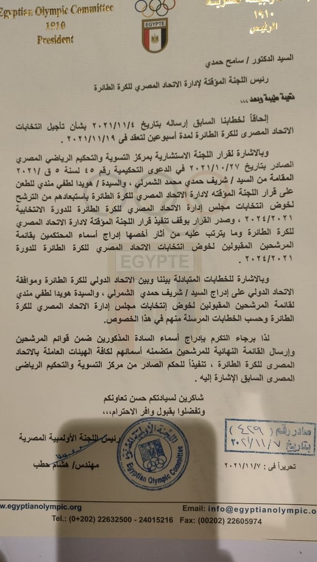 يبذل أعضاء اللجنة المؤقتة التى تدير اتحاد الكرة الطائرة وبعض العاملين فيه جهودا غير عادية لتأجيل الإنتخابات المحدد لها يوم الجمعة المقبل ، لمدة شهرين على الأقل ، بعد أن علم أعضاء اللجنة الذين يساندون القائمة الاخري فى الإنتخابات ، التفوق الكبير لقائمة شريف الشمرلى المرشح رقم وأحد على منصب الرئاسة هو وقائمته ، والتى تضم معه هناء حمزة فى منصب النائب وهويدا مندى على منصب أمانة الصندوق ، ومجموعة متميزة فى العضوية أمثال الكابتن أحمد الشموتي و العقيد تامر بيبرس والدكتور محمود الفقى والمحاسب شوكت صابر والدكتور عمرو طه ، وذلك بإرسال خطابات إلى اللجنة الأوليمبية المصرية لتأجيل الإنتخابات بسبب أن بعض الأندية التى جرت فيها الإنتخابات الفترة الماضية ، بعد تأجيل انتخابات الاتحاد من يوم 5 إلى يوم 19 نوفمبر ، لم تستطع تغيير المناديب الخاصة بها .