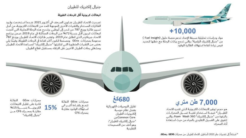 وفي إطار مذكرة التفاهم، ستتيح الاتحاد للطيران لشركة “جنرال إلكتريك” استخدام أسطولها من طائرات بوينغ 787، الذي يهيمن عليه طراز جرينلاينر الرائد، ليكون منصة لاختبار التقنيات الجديدة ومعدات المحركات بهدف الحد من الانبعاثات الكربونية وتحسين أداء محركات GEnx المركبة على هذه الطائرات. وستتم مشاركة بيانات هذه الاختبارات بين “جنرال إلكتريك” والاتحاد للطيران لتطبيق عمليات التحسين والتطوير ضمن أسطول طائرات بوينغ 787. كما اتفق الجانبان على التعاون لاستعراض قدرة الطائرات على استخدام وقود الطائرات المستدام بنسبة 100%.