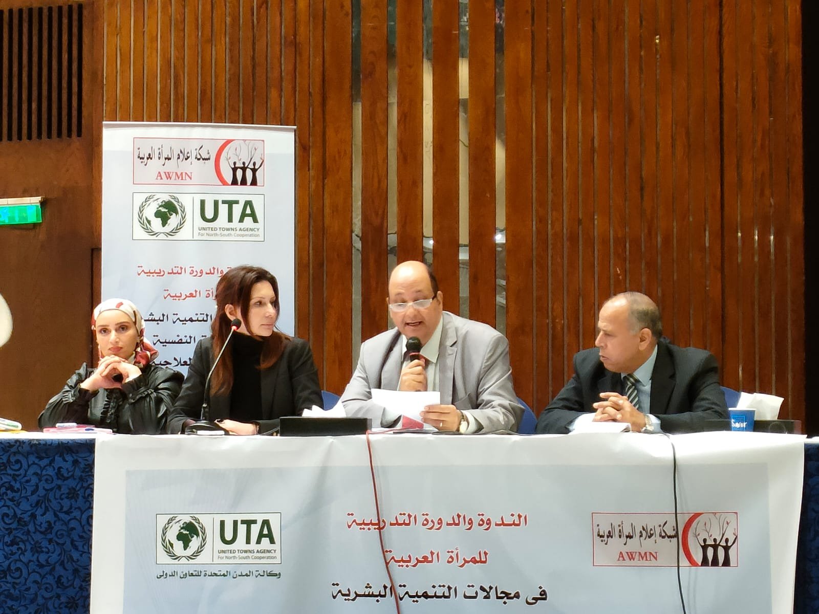 في بداية الندوة تحدث المستشار الإعلامي الدكتور معتز صلاح الدين مؤسس و رئيس شبكة إعلام المرأة العربية الذي اكد.أهمية هذه الندوة والدورة التدريبية التي أقيمت بالتعاون مع وكالة المدن المتحدة للتعاون الدولي التي تشغل منصب أمينها العام الأستاذة آيه السيف وهي أيضا نائب رئيس المكتب التنفيذي لشبكة إعلام المرأة العربية ، واكد أهمية هذه الدورة لتدريب عدد كبير من السيدات في هذه المجالات التي تتواكب مع مقتضيات وظروف العصر وأبلغ جميع الحاضرين إعتذار الأستاذة آيه السيف عن عدم الحضور من بلدها تونس حيث أنها اصيبت بوعكة صحية مفاجئة حالت دون حضورها هذه الندوة والدورة التدريبية داعيا لها بالشفاء العاجل وأشار فى كلمته إلى انه بعد قليل سوف تذاع كلمة متلفزة منها إلى الحاضرين على شاشات قاعة الندوة والدورة التدريبية