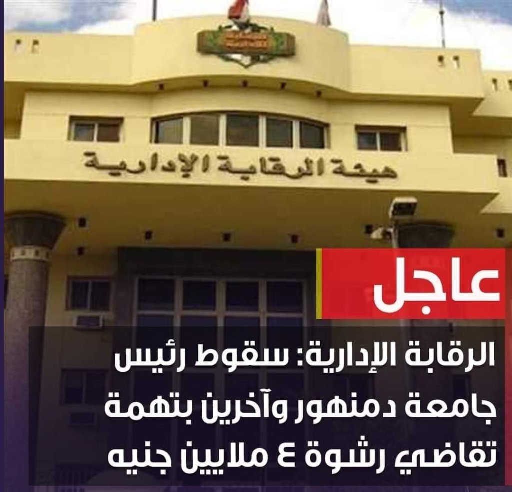 في ضربة جديدة من نوعها تمكنة الرقابة الإدارية من سقوط رئيس جامعة دمنهور وآخرين بتهمة تقاضي رشوة (4) ملايين جنيه وآخرين تقاضوا مبالغ مالية على سبيل الرشوة بلغت أربعة ملايين جنيه مقابل تسهيل وإستلام توريدات لصالح الجامعة.