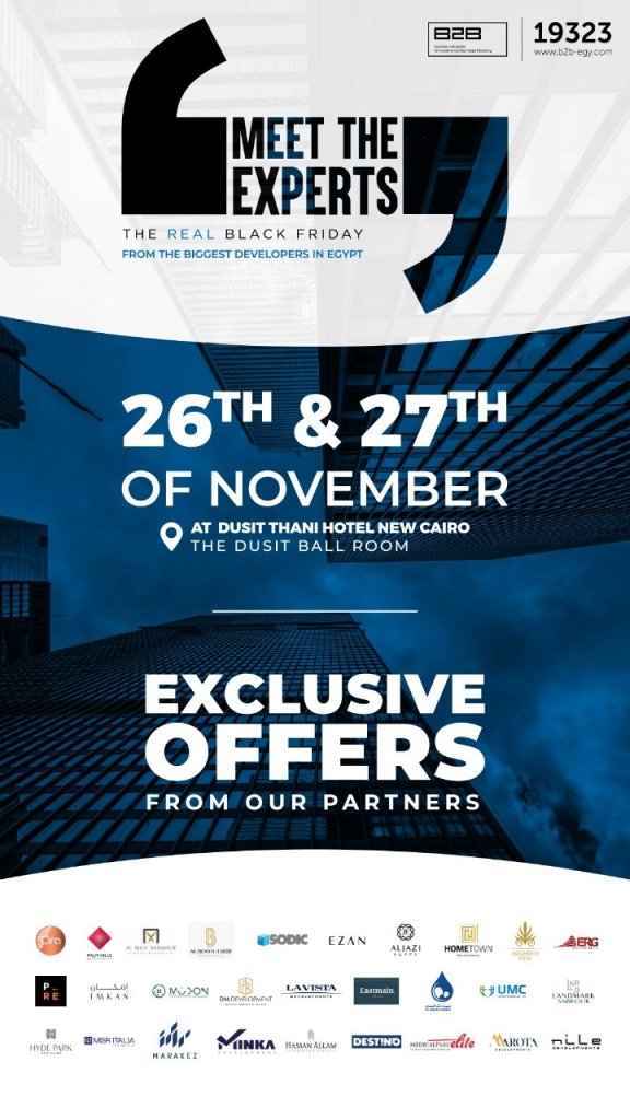 اعلنت شركة B2B للاستثمار والتسويق العقارى عن تنظيم معرض “Meet The Experts ” فى الفتره من 26 الى 27 نوڤمبر بفندق الدوسيت التجمع الخامس من 10 ص الى 10 م وهو من اهم واكبر المعارض التى يتم تنظيمها بالسوق المصرى والتى نالت عبر دوراتها السابقه ثقة العملاء.