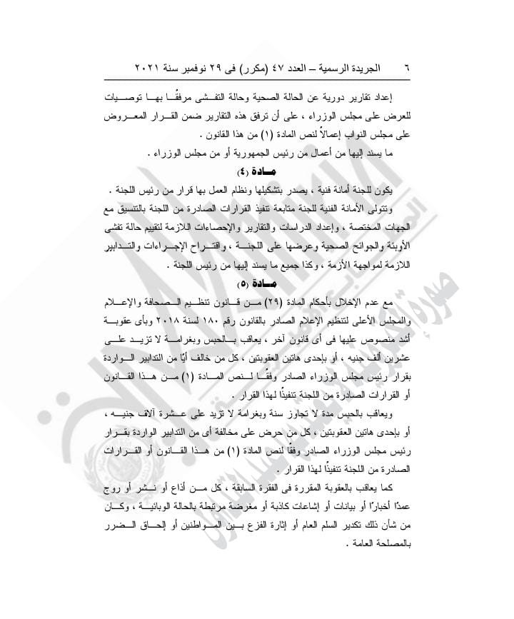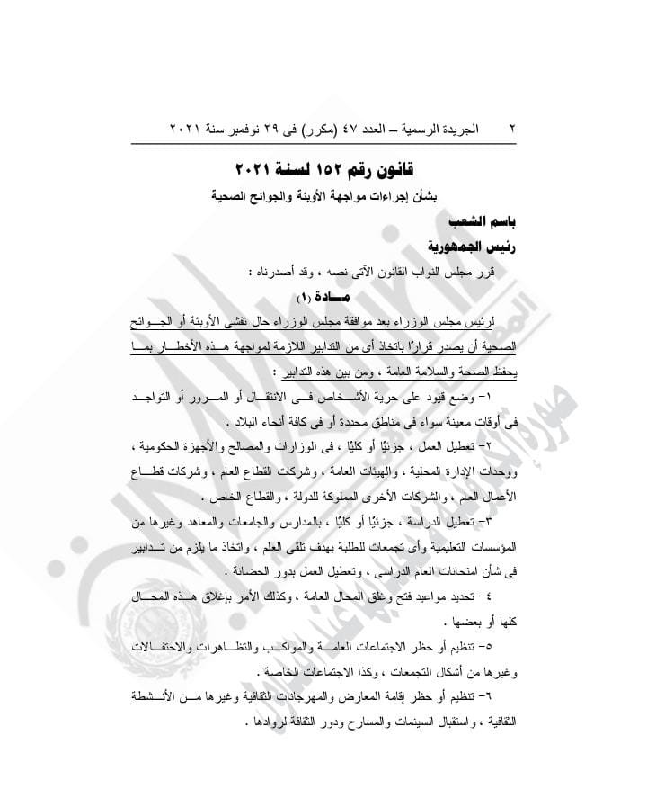 ونشرت الجريدة الرسمية قرار الرئيس عبد الفتاح السيسى بالتصديق على القانون رقم 152 لسنه 2021 بشأن إجراءات مواجهه الأوبئة والجوائح الصحية.
