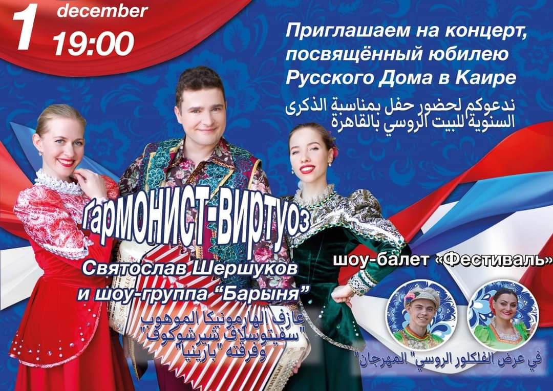 فى اطار الاحتفال بالذكرى السنوية على تأسيس المركز الثقافى الروسى بالقاهرة، ينظم البيت الروسى حفلاً موسيقياً لعازف الأوكورديون العالمى “سفيتاسلاف شيرشوكوف” وفرقته “بارينيا”، في الأول من ديسمبر2021 فى تمام الساعة السابعة مساء على مسرح تشايكوفيسكى بمقر المركز بالدقى.