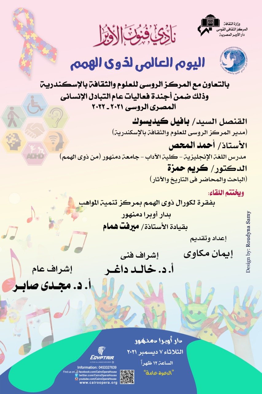 تحت رعاية اللواء / هشام آمنة ــ محافظ البحيرة ود مجدى صابر رئيس الأوبرا المصرية واستمرارا لفعاليات عام التبادل الثقافي بين روسيا ومصر عام ٢٠٢١، وفى إطار الاحتفال باليوم العالمي لذوي الهمم والذي يهدف إلى زيادة الفهم لقضايا ذوي الهمم وادماجهم في الحياة السياسية والاقتصادية والثقافية.