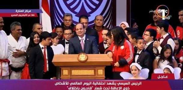 شهد فخامة الرئيس عبدالفتاح السيسى صباح الاحد الاحتفالية التى اقيمت بمركز المنارة الدولى للمؤتمرات باليوم العالمى لمتحدى الاعاقة اصحاب الهمم قادرون باختلاف والتى اقرته الجمعية العامة لامم المتحدة