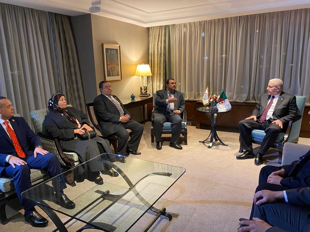 ومن جانبه، ثمَّن “العسومي” الدعم الذي تقدمه الجمهورية الجزائرية للبرلمان العربي منذ تأسيسه، مشيراً إلى أن قرار إنشاء البرلمان العربي الذي تم اتخاذه في القمة العربية التي استضافتها الجمهورية الجزائرية في عام 2005، ومشيداً باستضافة الجزائر القمة العربية المقبلة في شهر مارس القادم، ومعرباً عن ثقته في أن هذه القمة ستكون إيذاناً ببدء مرحلة جديدة من التضامن العربي وتعزيز مسيرة العمل العربي المشترك من أجل مواجهة كافة التحديات التي تواجهها الأمة العربية، كما أكد على دعم البرلمان العربي لإنجاح هذه القمة، بما يعزز الأمن والاستقرار في الدول العربية، ويصون مقدرات شعوبها ويحقق تطلعاتها في العيش في أمن وتنمية واستقرار.