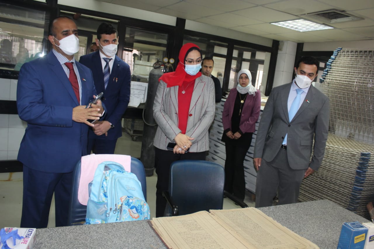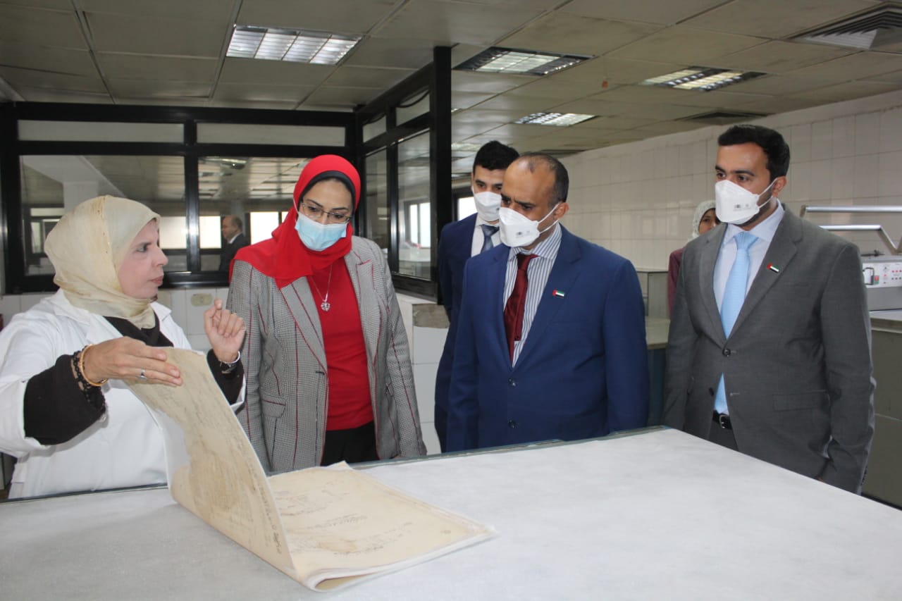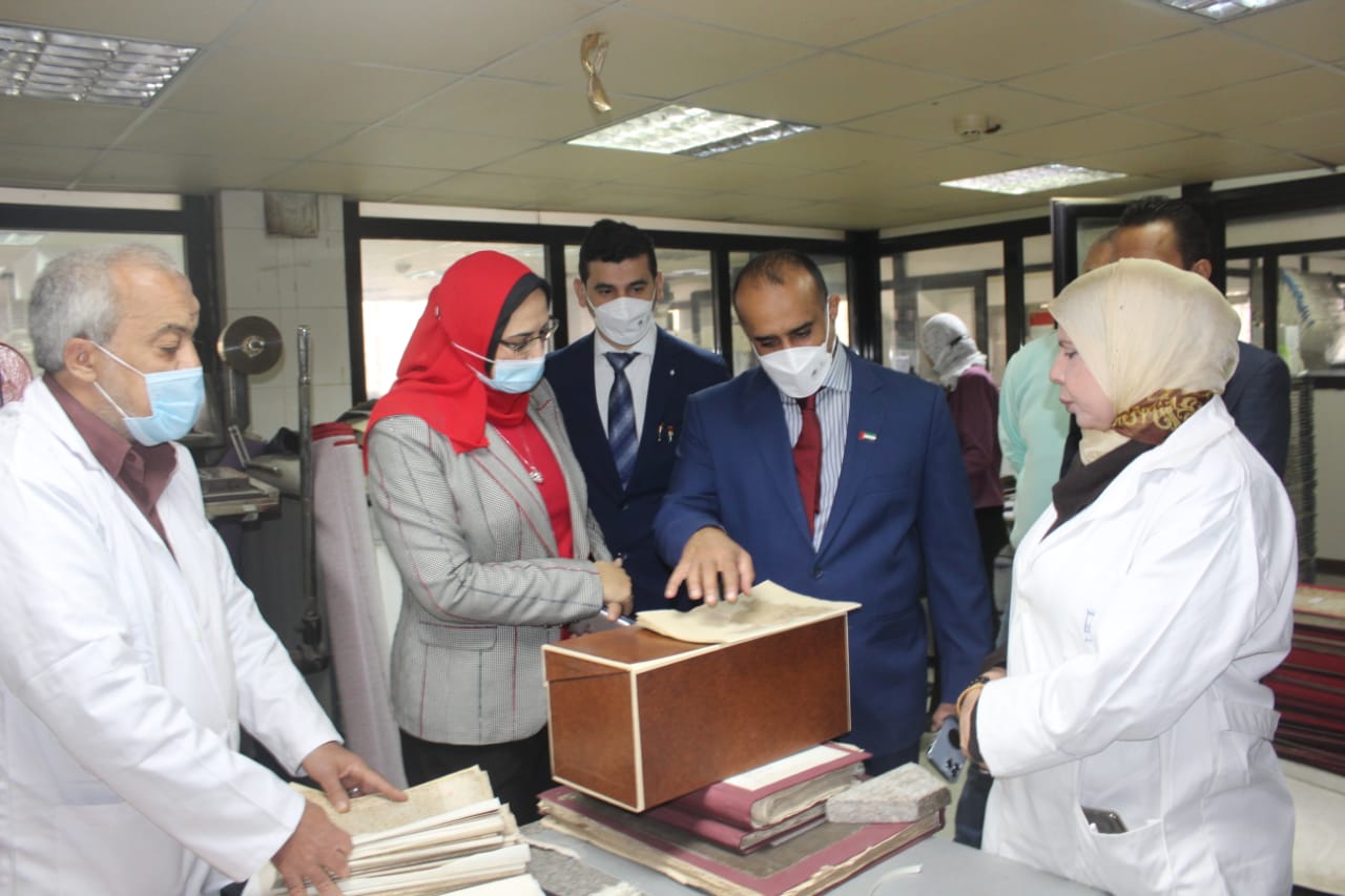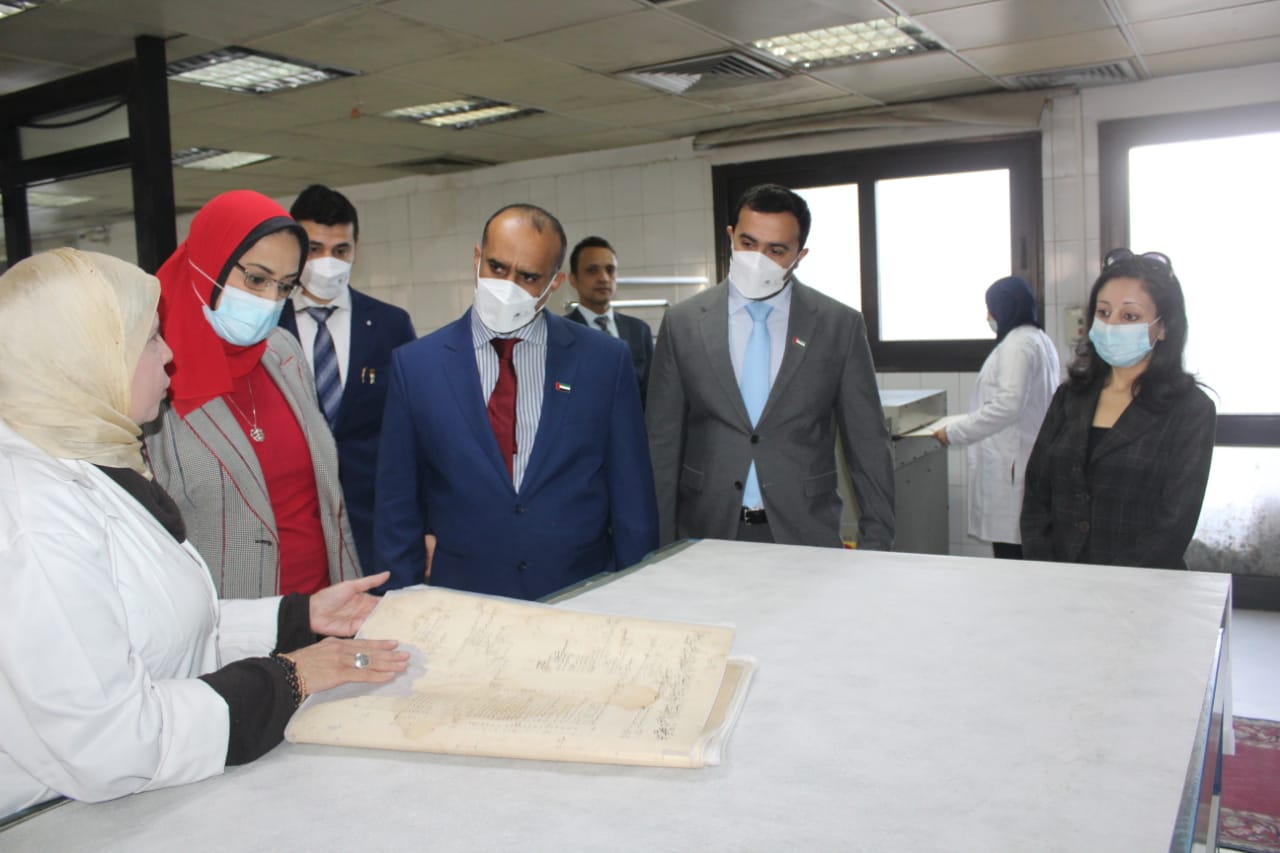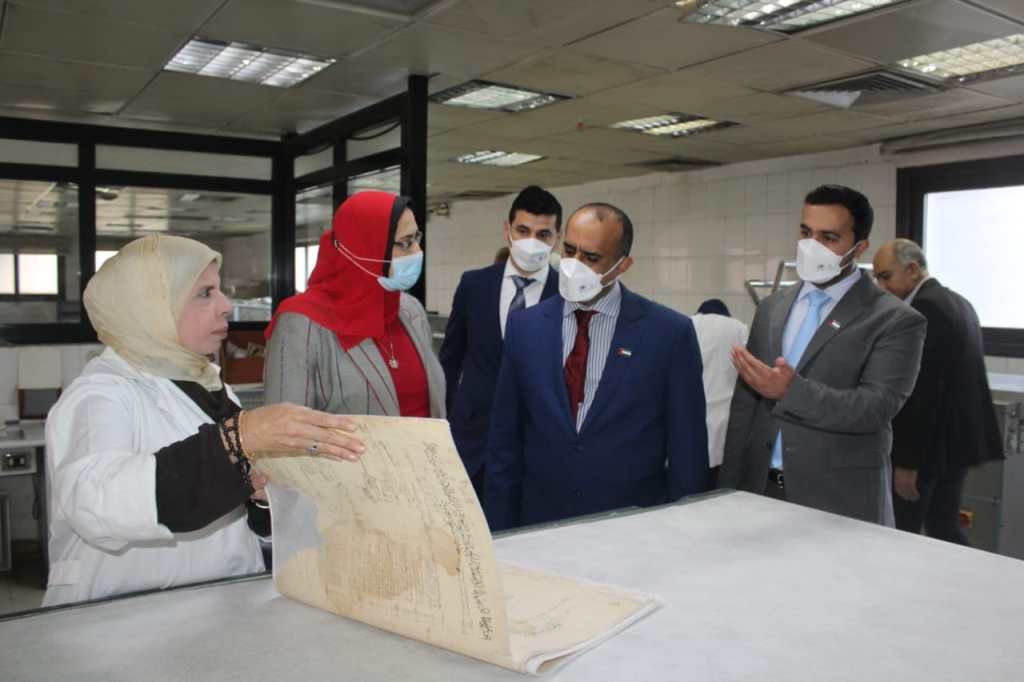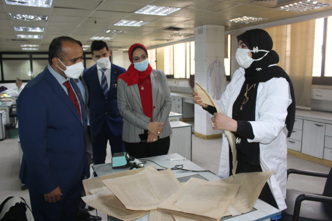 وبدأت الزيارة بقاعة البحث في دار الوثائق حيث تم الاطلاع على نماذج من حجج الأمراء والسلاطين والفرمانات وسجلات المحاكم الشرعية. ثم توجه الوفد إلى وحدة التصوير عال الجودة (المسح الرقمي) ومعمل الترميم بدار الوثائق حيث تعرفوا على جهود دار الوثائق في حفظ وصيانة وترميم الوثائق من خلال المعالجات البيئية والكيميائية المختلفة وأشاد أفراد الوفد بخبرات دار الكتب والوثائق في ذلك المضمار.
