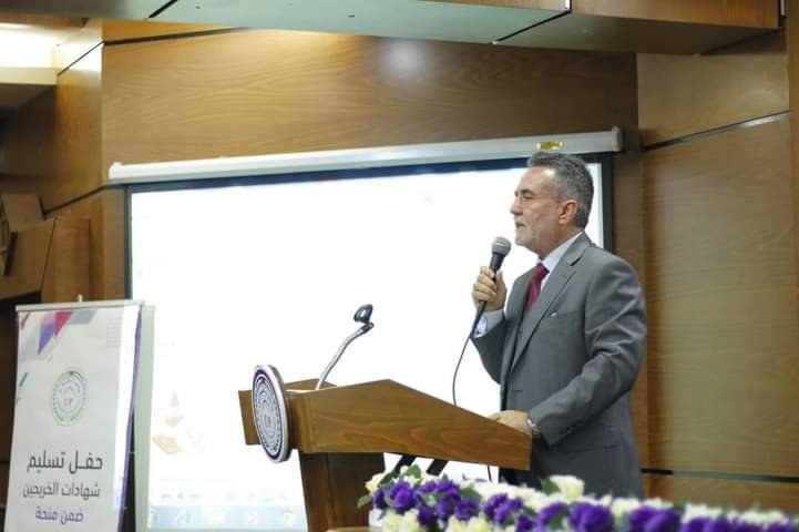 حيث افتتح الأستاذ الدكتور جبر الداعور كلمته مهنئا الطلاب على ما بذلوه من جد واجتهاد وصولا الى التخرج، داعيا اياهم اكمال مسيرتهم التعليمية و عدم التوقف عن طلب العلم ، وذلك لأن العلم متجدد و التحديات كثيرة ، كما وجه شكره لمعالي السفير المهندس فتحي عفانة على دعمه الدائم للطلبة و لما يقدمه لأبناء الشعب الفلسطيني من أعمال خيرية ملموسة للتخفيف عن كاهل أسر الشعب الفلسطيني قدر الإمكان . مؤكداً أن سعادة المهندس فتحي عفانه يقدم أعماله الخيرية لكل أبناء الأمة العربية و الاسلامية أينما وجدوا.