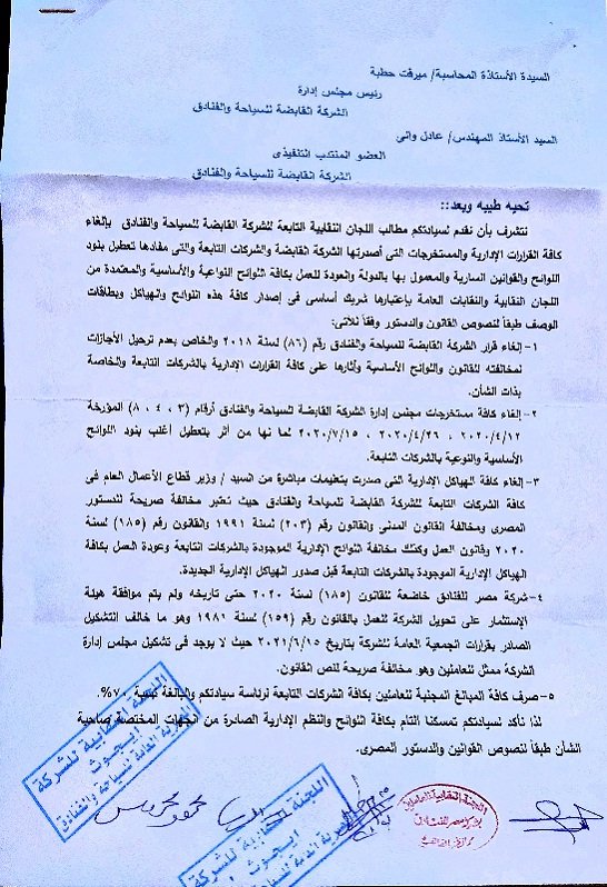جاءت مطالب اللجان النقابية :بإلغاء قرار الشركة القابضة للسياحة والفنادق رقم “٨٦” لسنة ٢٠١٨ والخاص بعدم ترحيل الأجازات لمخالفته للقانون واللوائح الأساسية وآثارها علي كافة القرارات الإدارية بالشركات التابعة والخاصة بذات الشأن.