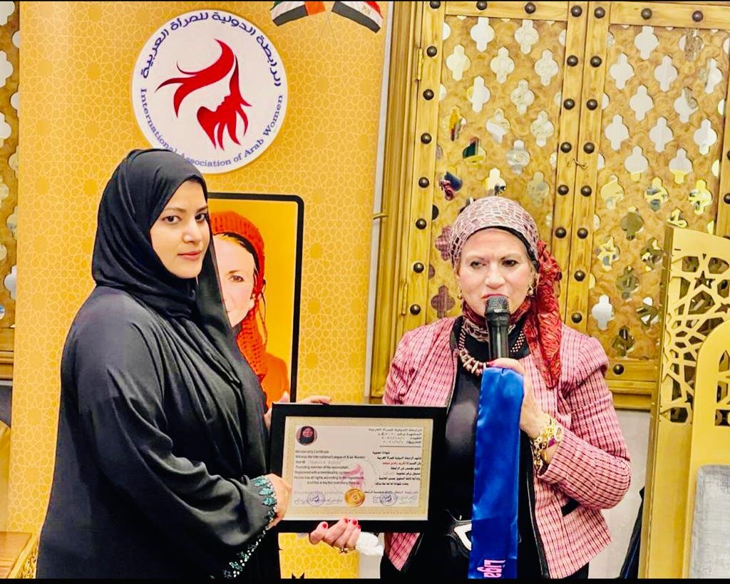 بشموليتها لكافة أعضائها في كل الدول والبلدان فأهلاً وسهلاً ومرحباً ًبكم وتقبلوا شكري وتقديري على حضوركم الذي يمثل عصب النجاح للرابطة فأهلاً وسهلاً وأسمحوا لي أن أرحب بإسمي وإسمكم جميعاً للسيدات والسادة ضيوف هذه الإحتفالية ومشاركتهم لنا في هذه الإحتفالية وكان قبل ذلك قدم سعادة المستشار الإعلامي، مدير ومؤسس قناة أهل الدار دكتور جاسم عبيد مدير مكتب الرابطة بدولة الإمارات العربية المتحدة سعادة الدكتورة سهير الغنام ثم منحته عضوية الرابطة ونوط الرابطة والوشاح وتم تنصيبه أمين الصندوق للرابطة الدولية للمرأة العربية بالإمارات