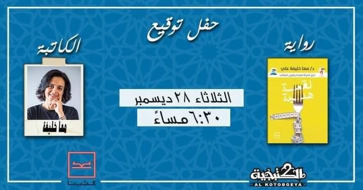 تتشرف الكتبجية بدعوتكم لحضور حفل توقيع كتاب “لقمة هنية” للكاتبة الدكتورة “مها خليفة” الثلاثاء الموافق 28 ديسمبر 2021 الساعة 6:30 مساءً.