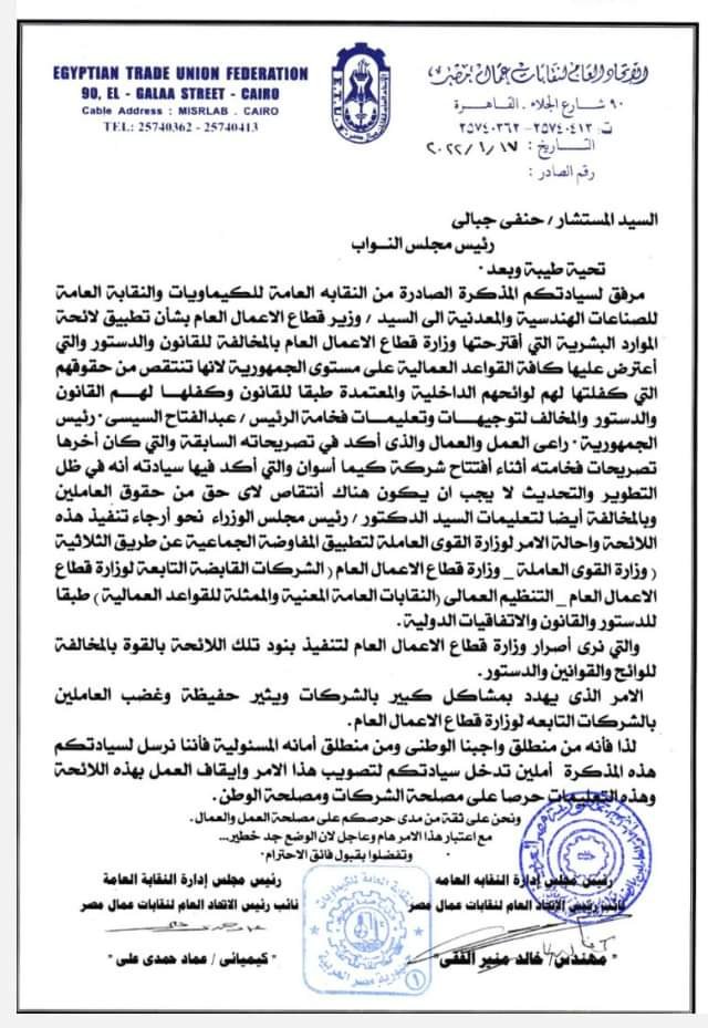 وكانت النقابتين بتاريخ ١٧ يناير ٢٠٢٢ ارسلت بمذكرة الي المستشار حنفي جبالي رئيس مجلس النواب ، تؤكد من خلالها رفضها كافة محاولات هشام توفيق وزير قطاع الاعمال العام ، لتطبيق لائحة الموارد البشرية للعاملين داخل الشركات التابعة للوزارة ،وذلك رغم اعتراض النقابات العامة ،واللجان النقابية عليها ،لكونها تنتقص من حقوق العمال.