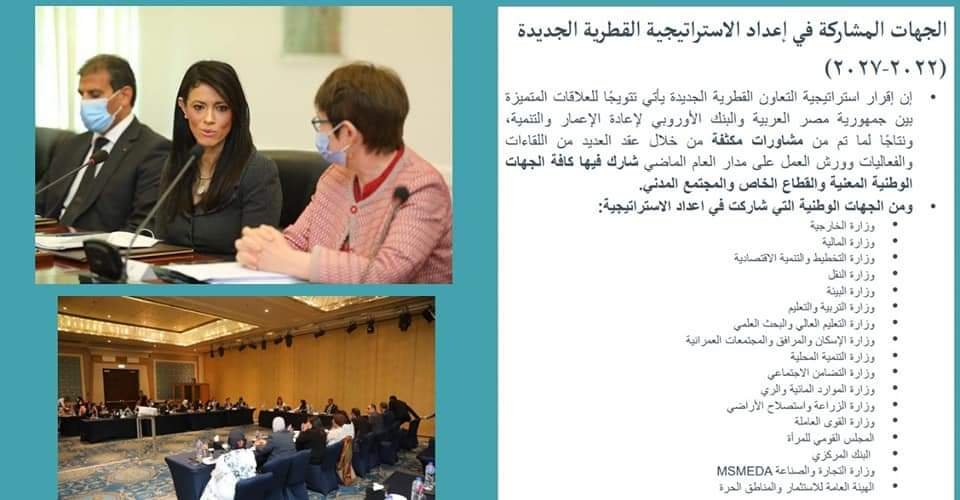 وخلال العام الماضي نفذت وزارة التعاون الدولي، خارطة طريق إعداد الاستراتيجية القطرية الجديدة مع البنك الأوروبي لإعادة الإعمار والتنمية، بمشاركة أكثر من 20 جهة وطنية فضلا عن القطاع الخاص والمجتمع المدني، حيث تم عقد العديد من اللقاءات والفعاليات وورش العمل، للتعرف على الأولويات القطاعية، والأخذ بملاحظات كافة الجهات المشاركة لتضمينها في مشروع الاستراتيجية، لتعبر عن برنامج الحكومة وتوجهات وأولويات كافة القطاعات، التي تأتي في ضوء الرؤية الكلية للدولة واستراتيجية التنمية المستدامة ٢٠٣٠.