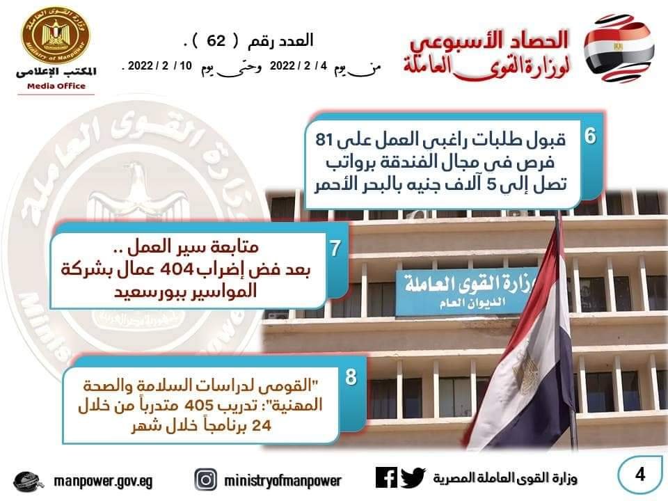 شهد حصاد الأسبوع الحالي، في وزارة القوى العاملة العديد من الأحداث المهمة خلال الفترة 4 من إلى 10 فبراير الجاري- منها وزير القوى العاملة ومحافظ جنوب سيناء يسلمون 120 وثيقة تأمين تكافلي للعمالة غير المنتظمة بمتحف شرم الشيخ ، وتوفير 6703 فرصة عمل للذكور والإناث، منها “قادرون باختلاف” برواتب مجزية في 18 محافظة ، وتعيين 3675 شاباً في 5 محافظات ، واسترداد 3.9 مليون جنيه مستحقات العمالة المصرية في الأردن والسعودية ،وتحصيل 7.5 مليون ليرة لبنانية لـ 5 عمال مصريين في بيروت.