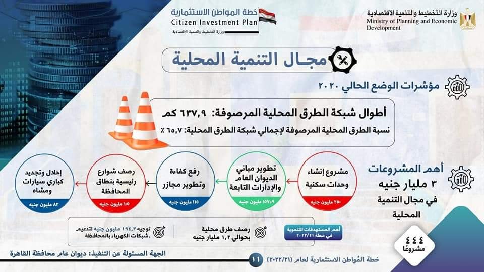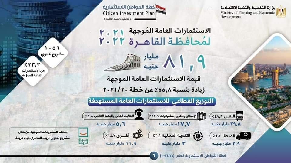 أعلنت وزارة التخطيط والتنمية الاقتصادية في تقرير صادر عنها ملامح خطة المواطن الاستثمارية لمحافظة القاهرة لعام 21/2022 ، وذلك في إطار مواصلة الإعلان عن خطة المواطن في كافة محافظات الجمهورية للعام الثالث على التوالي، بهدف توعية المواطنين بشأن توجهات وأولويات خطة التنمية المستدامة للعام المالي (21/2022)، ودورها في تحقيق “رؤية مصر 2030”.