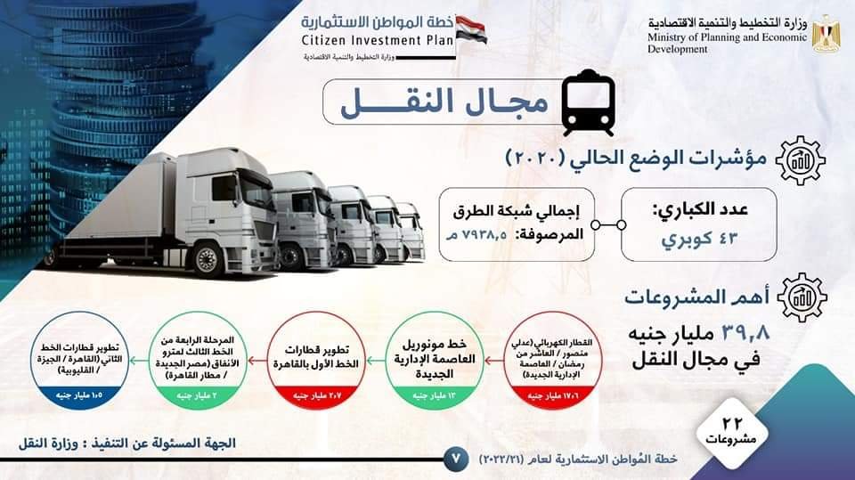 وفيما يتعلق بالتوزيع القطاعي للاستثمارات العامة المستهدفة بمحافظة القاهرة بخطة عام 21/2022 أشار تقرير وزارة التخطيط والتنمية الاقتصادية إلى توجيه استثمارات بقيمة 39,8 مليار جنيه لقطاع النقل بنسبة 48,6%، يليه قطاع الإسكان وتطوير العشوائيات بقيمة 17,7 مليار جنيه بنسبة 21,6%، وتبلغ استثمارات قطاع التعليم العالي والبحث العلمي 5,6 مليار جنيه بنسبة 6,8%، ويخص قطاع الصحة 3,9 مليار جنيه بنسبة 4,7%، وقطاع التنمية المحلية 3 مليار جنيه بنسبة 3,6%، أما القطاعات الأخرى فيخصها استثمارات بقيمة 11,9 مليار جنيه بنسبة 14,7%.