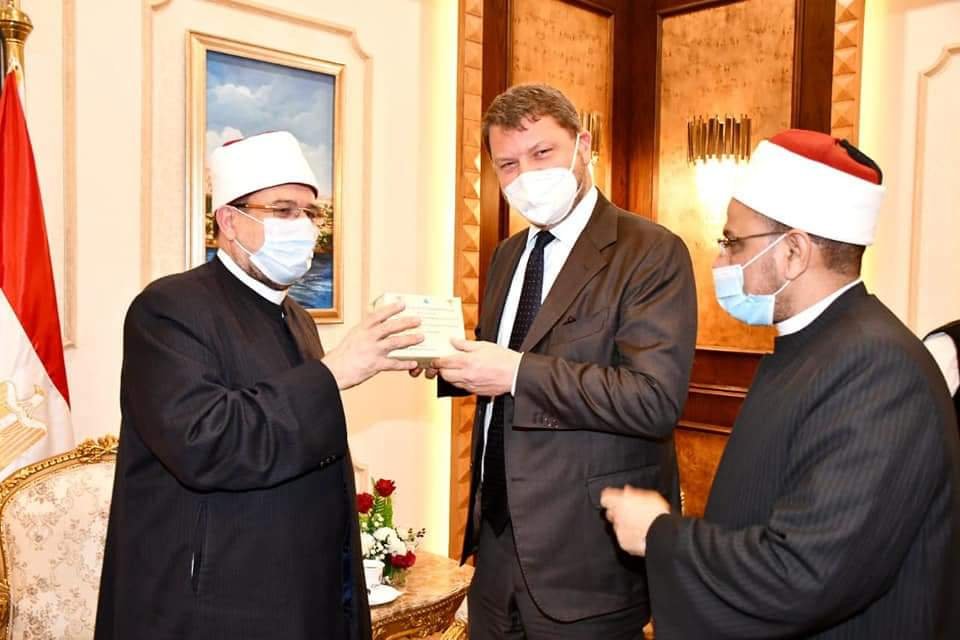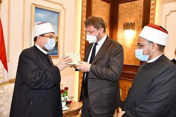 هذا وقد أهدى معالي وزير الأوقاف السيد/ جينارو ميجلور رئيس برلمان البحر الأبيض المتوسط نسختين من سلسلة “رؤية” باللغة الإنجليزية ، التي تسعى إلى نشر صحيح الدين ومواجهة الفكر المتطرف ، وهو ما حاز ثناء وإعجاب وإشادة سيادته بهذه الإصدارات المتميزة.