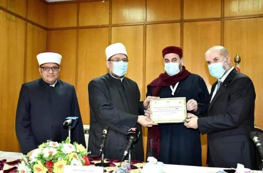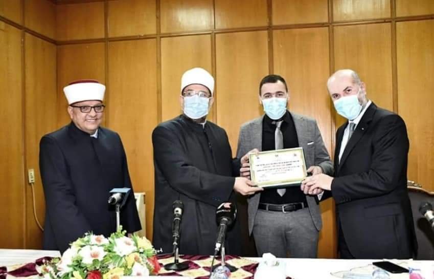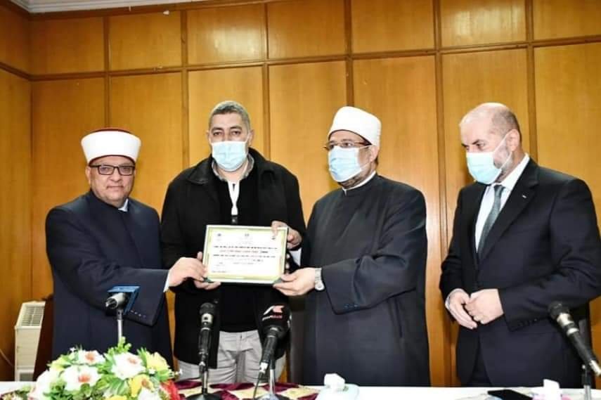 وفي ختام الحفل كرَّم معالي أ.د/ محمد مختار جمعة وزير الأوقاف ، ومعالي الشيخ/ حاتم محمد حلمي وزير الأوقاف والشئون الدينية الفلسطيني ، ومعالي الدكتور/ محمود صدقي الهباش مستشار الرئيس الفلسطيني للشئون الدينية وقاضي قضاة فلسطين الأئمة من مصر وفلسطين المشاركين في الدورة التدريبية المشتركة ، وتم منحهم شهادة حضور الدورة.