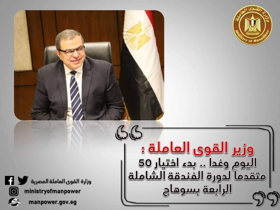 أعلن وزير القوي العاملة محمد سعفان عن بدء المقابلات الشخصية اليوم الأربعاء وغدا الخميس (23 و24 فبراير الجاري) لاختيار 50 متقدما من المتدربين للدورة الرابعة للفندقة الشاملة بسوهاج والتي تنفذها وزارة القوي العاملة بالتعاون مع برنامج الأغذية العالمي التابع للأمم المتحدة ومنتجع هيلتون الأقصر ، مشيرا إلي أنه يتم المقابلات بديوان عام مديرية القوي العاملة بسوهاج.