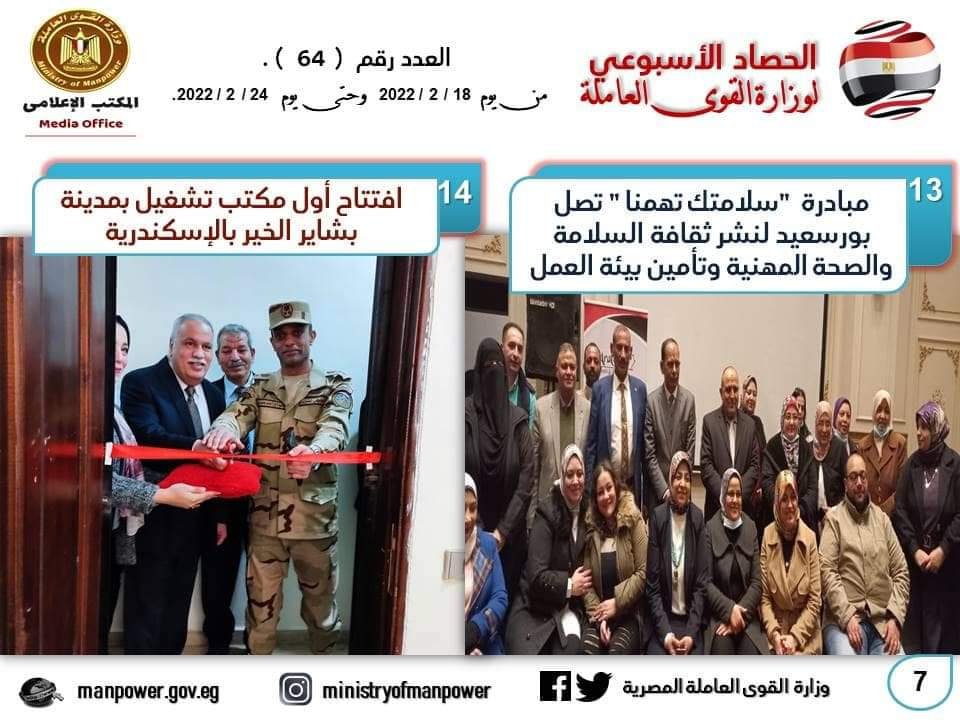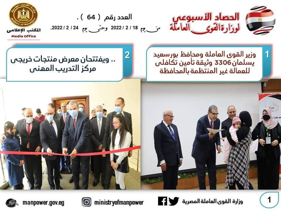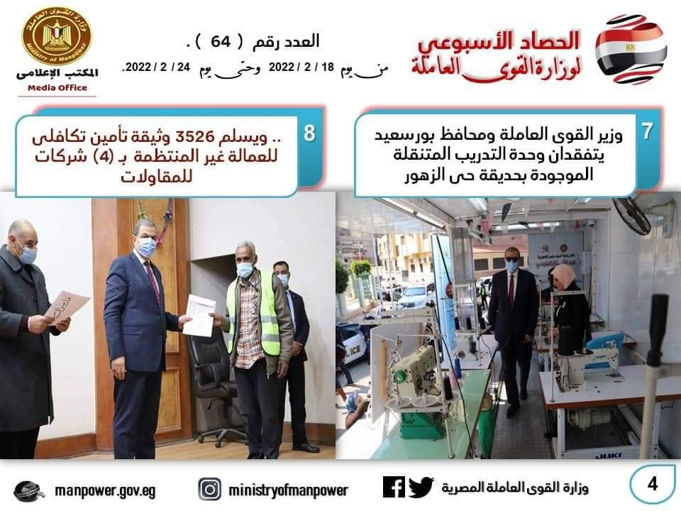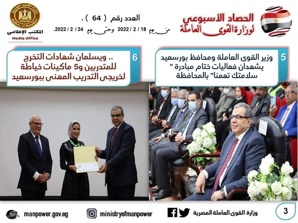 شهد حصاد الأسبوع الحالي، في وزارة القوى العاملة العديد من الأحداث المهمة خلال الفترة 18 من إلى 24 فبراير الجاري- حيث واصل وزير القوى العاملة جولاته الميدانية للمحافظات ، بجولة في محافظة بورسعيد في إطار المبادرة الرئاسية “حياة كريمة” ، وقام يرافقة المحافظ اللواء عادل الغضبان بتسليم 3306 وثيقة تأمين تكافلي للعمالة غير المنتظمة ، و 100 عقد عمل لأصحاب والقدرات ، و10 شهادات اتمام التدريب المهني ، و5 ماكينات خياطة لـ 5 متدربات ، وافتتحا معرض منتجات المتدربين والمتدربات ، وشهدا ختام فعاليات مبادرة سلامتك تهمنا لنشر ثقافة السلامة والصحة المهنية ، وزرعا 3 شجرات ضمن 1000 شجرة زيتون وليمون بحديقة حي الزهور في إطار مبادرة “هنجملها” ، وتفقدا وحدة التدريب المتنقلة الموجودة بالمحافظة .