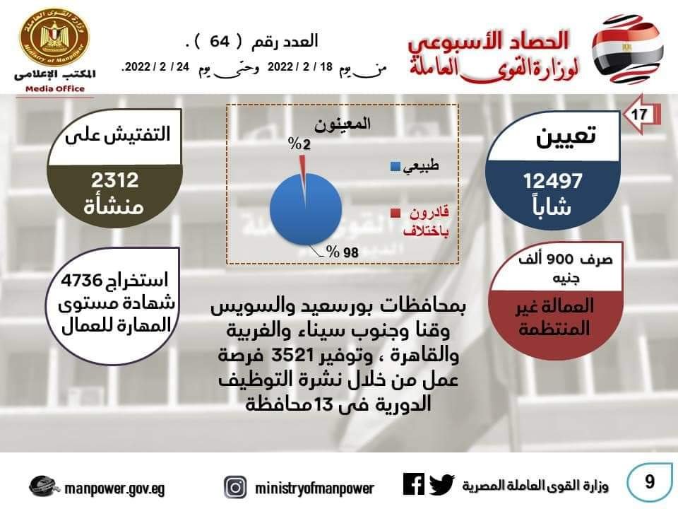 وعلى جانب آخر تمكنت وزارة القوى العاملة من خلال نشرة التوظيف التي تصدرها نصف شهرية من توفير 2530 فرصة عمل للذكور والإناث، منها “قادرون باختلاف” في جميع التخصصات والقطاعات الوظيفية المختلفة، بأجور مجزية تصل إلى 9 آلاف جنيه في بعض المهن وطبقا لخبرة المتقدم، فضلا عن التأمين الصحي والاجتماعي، وذلك من خلال 68 شركة ومصنع قطاع خاص في 13 محافظة لشغلها خلال شهر فبراير ومارس 2022.