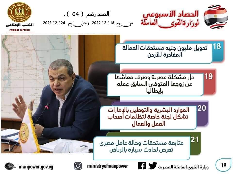 وامتد الحصاد ليشمل ، نجاح مكتب التمثيل العمالي التابع للوزارة بالسفارة المصرية بعمان-الأردن، بالمتابعة اللحظية والجهود المبذولة والمقابلات مع المسئولين بمؤسسة الضمان الاجتماعي بالأردن، واستكمالا لما تم تحويله سابقا، تم تحويل القائمة الـ 69 من مستحقات الضمان الاجتماعي لنحو 36 عامل مصري لدى المؤسسة غادروا عمان نهائيا.