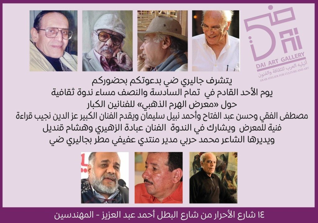 يشهد جاليري «ضي» بالمهندسين، في السادسة والنصف من مساء غد الأحد، ندوة فنية حول معرض “الهرم الذهبي” للفنانين الكبار الدكتور مصطفي الفقي والدكتور أحمد نبيل سليمان والدكتور حسن عبد الفتاح.